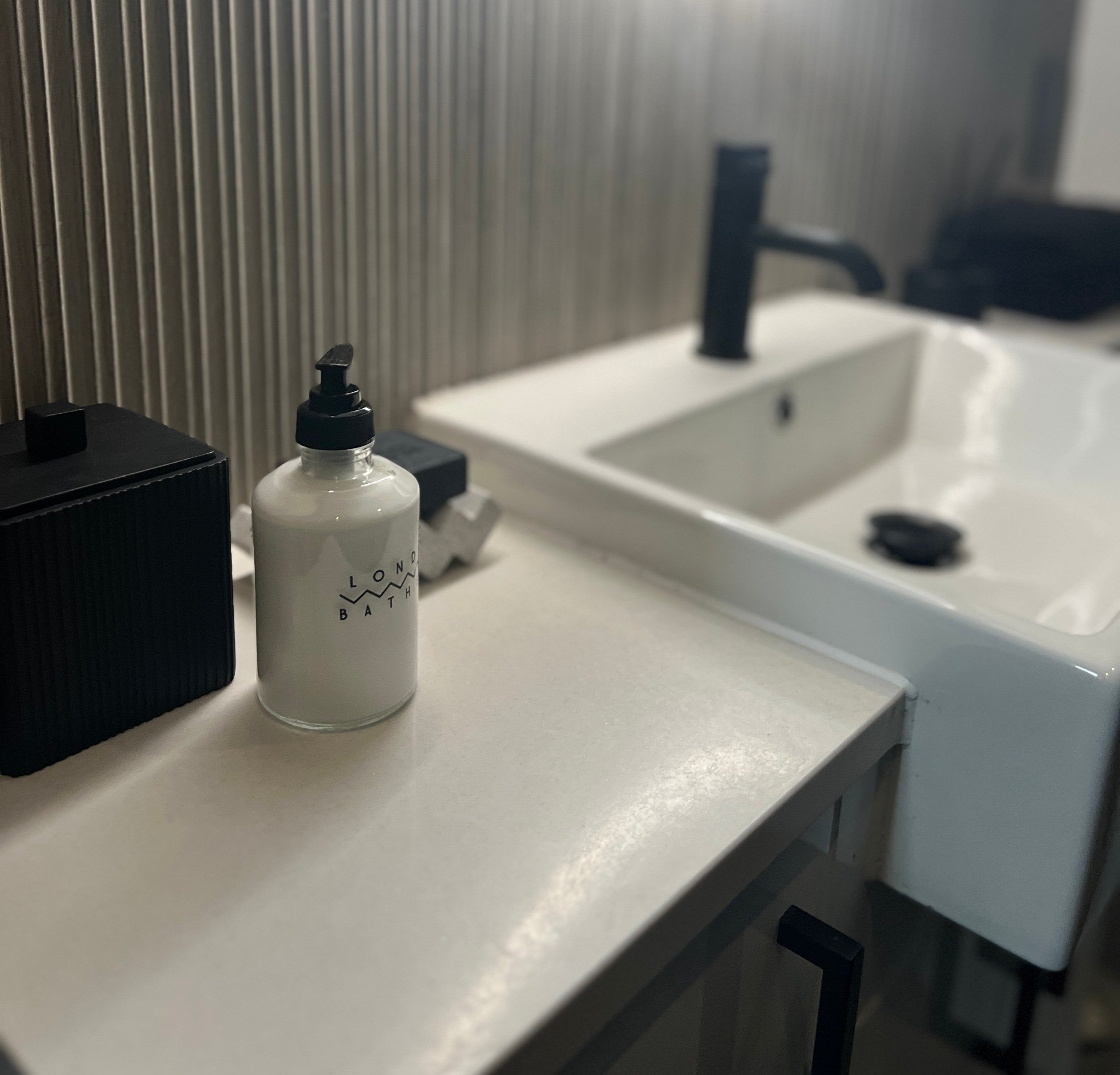 Sustainability: Like most of the interiors industry, Falchi Interiors is monitoring our sustainability and that of our suppliers. London Bathers products are manufactured in the UK with natural ingredients and designed to reduce waste. The glass bottles are refillable to minimise waste and the soap is naturally scented using essential oils.”